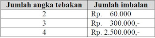 – Setiap kupon hanya bisa diisi dengan 1 bilangan (2 angka, 3 angka, atau 4 angka) Jika tebakan benar maka si pemain mendapatkan hadiah, dengan ketentuan sesuai jumlah angka tebakan yang dipasang: