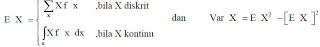 Jika X adalah variabel random dengan fungsi probabilitas f(x), maka nilai harapan atau ekspektasi (E(X)) dan variansi (Var(X)) dari X adalah: