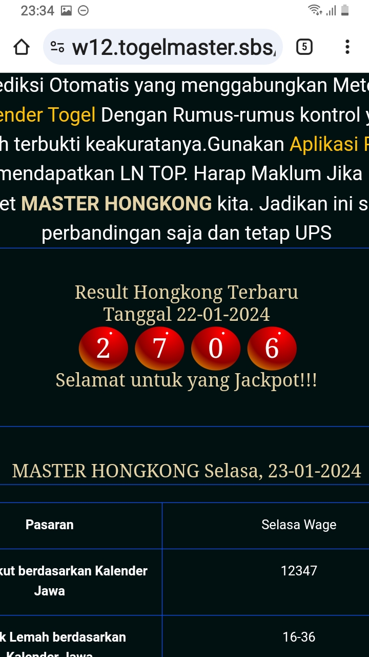 MASTER HONGKONG Selasa, 03-02-2026 Merupakan Prediksi Otomatis yang menggabungkan Metode Kalender Togel Dengan Rumus-rumus kontrol yang sudah terbukti keakuratanya.Gunakan Aplikasi Rekap untuk mendapatkan LN TOP. Harap Maklum Jika kadang meleset MASTER HONGKONG kita. Jadikan ini sebagai perbandingan saja dan tetap UPS