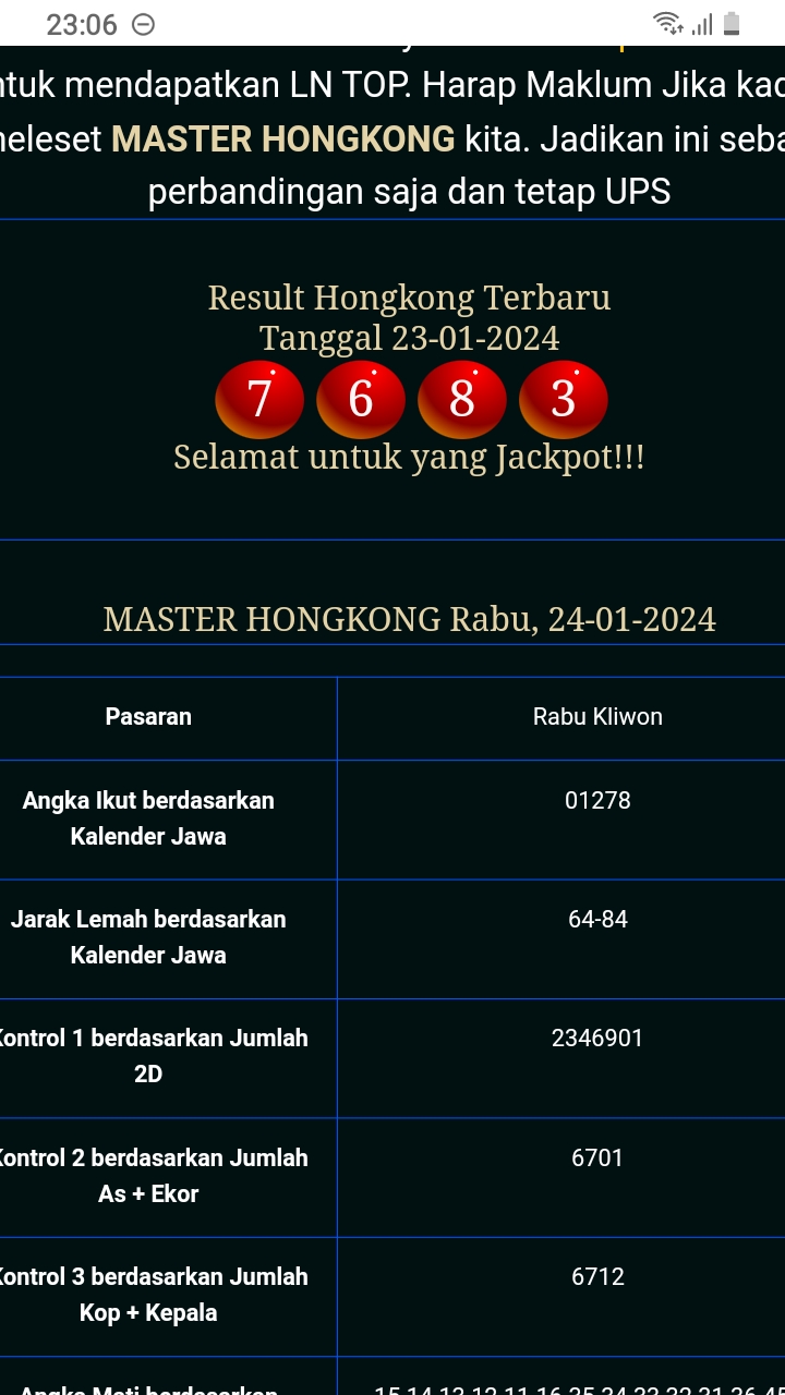 MASTER HONGKONG Selasa, 03-02-2026 Merupakan Prediksi Otomatis yang menggabungkan Metode Kalender Togel Dengan Rumus-rumus kontrol yang sudah terbukti keakuratanya.Gunakan Aplikasi Rekap untuk mendapatkan LN TOP. Harap Maklum Jika kadang meleset MASTER HONGKONG kita. Jadikan ini sebagai perbandingan saja dan tetap UPS