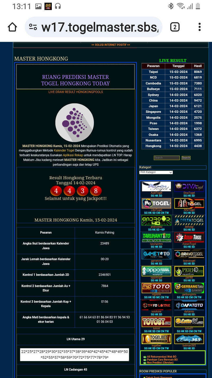 MASTER HONGKONG Selasa, 03-02-2026 Merupakan Prediksi Otomatis yang menggabungkan Metode Kalender Togel Dengan Rumus-rumus kontrol yang sudah terbukti keakuratanya.Gunakan Aplikasi Rekap untuk mendapatkan LN TOP. Harap Maklum Jika kadang meleset MASTER HONGKONG kita. Jadikan ini sebagai perbandingan saja dan tetap UPS