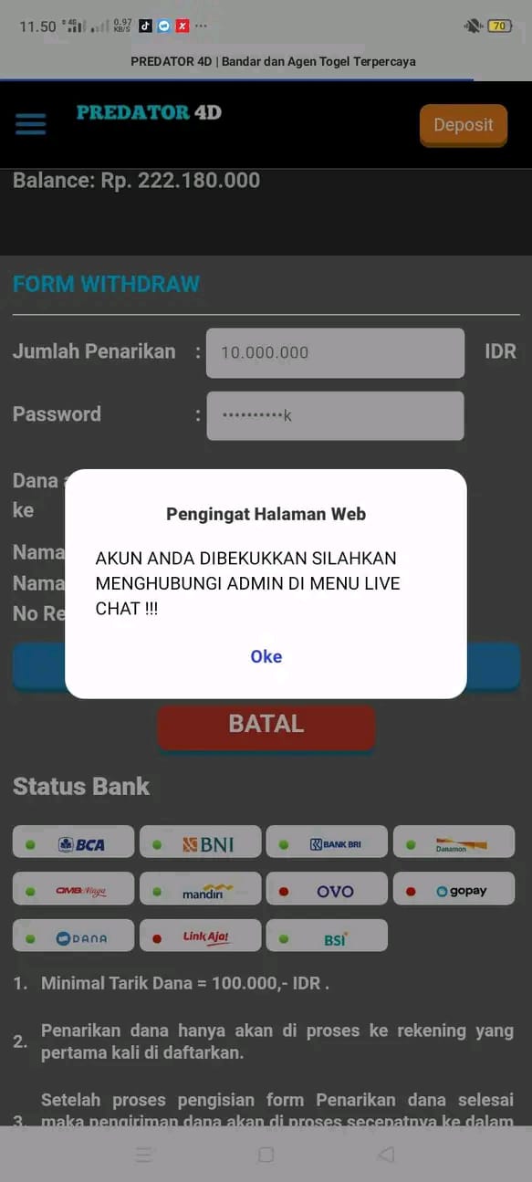 Jangan pernah main di Predator 4d,, teman saya korban, JP 200jt Up langsung dibekukan akunnya