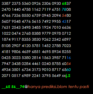 Prediksi Ini Berubah secara otomatis sesuai hari dan result pasaran masing-masing. Untuk melihat prediksi sebelumnya klik tombol nomor hitam diatas