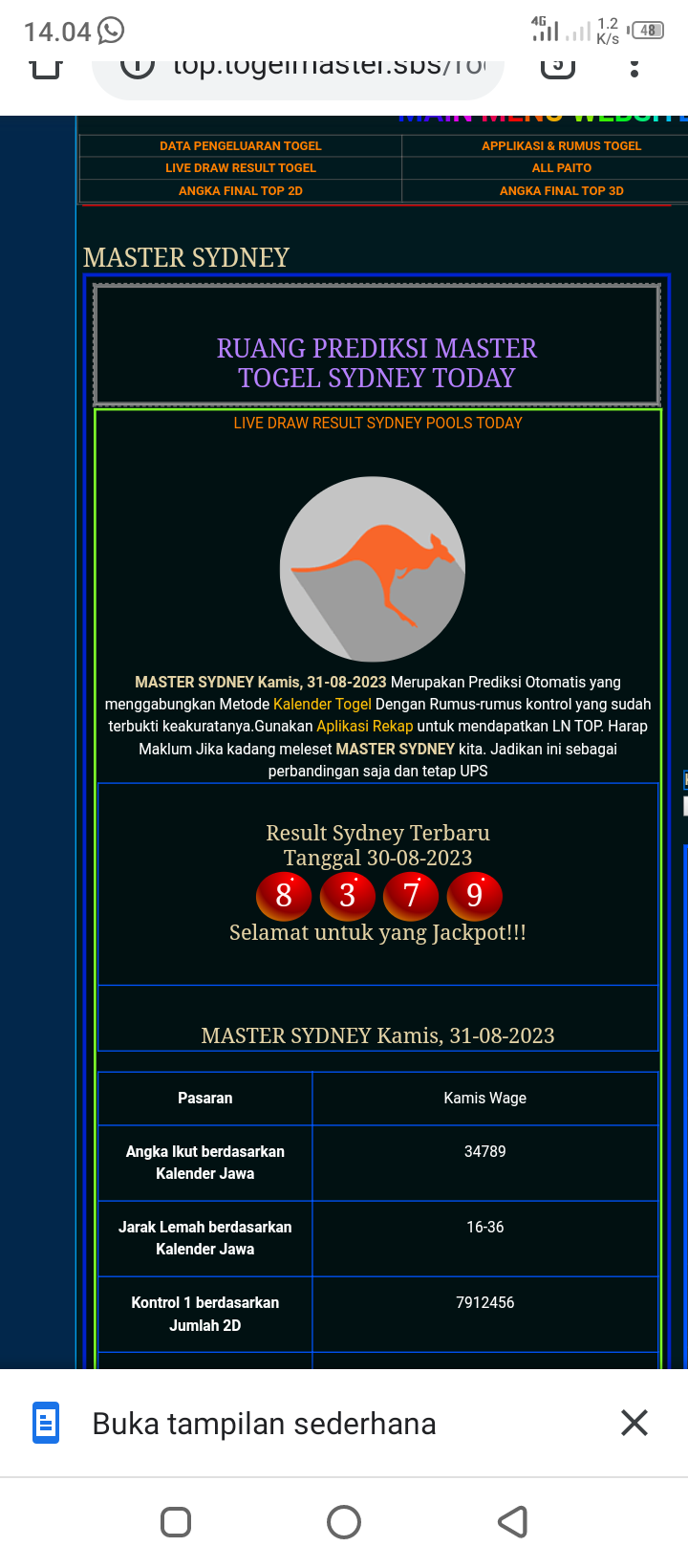 MASTER SYDNEY Selasa, 03-02-2026 Merupakan Prediksi Otomatis yang menggabungkan Metode Kalender Togel Dengan Rumus-rumus kontrol yang sudah terbukti keakuratanya.Gunakan Aplikasi Rekap untuk mendapatkan LN TOP. Harap Maklum Jika kadang meleset MASTER SYDNEY kita. Jadikan ini sebagai perbandingan saja dan tetap UPS
