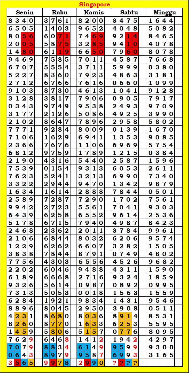 MASTER SINGAPURA Kamis, 05-02-2026 Merupakan Prediksi Otomatis yang menggabungkan Metode Kalender Togel Dengan Rumus-rumus kontrol yang sudah terbukti keakuratanya.Gunakan Aplikasi Rekap untuk mendapatkan LN TOP. Harap Maklum Jika kadang meleset MASTER SINGAPURA kita. Jadikan ini sebagai perbandingan saja dan tetap UPS