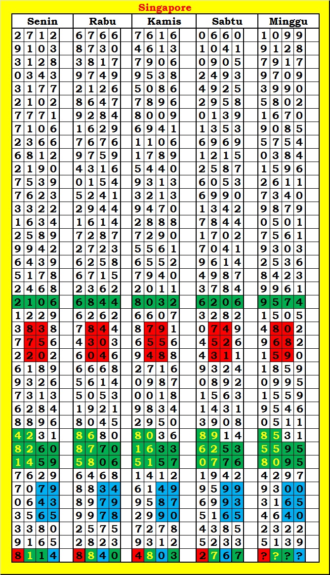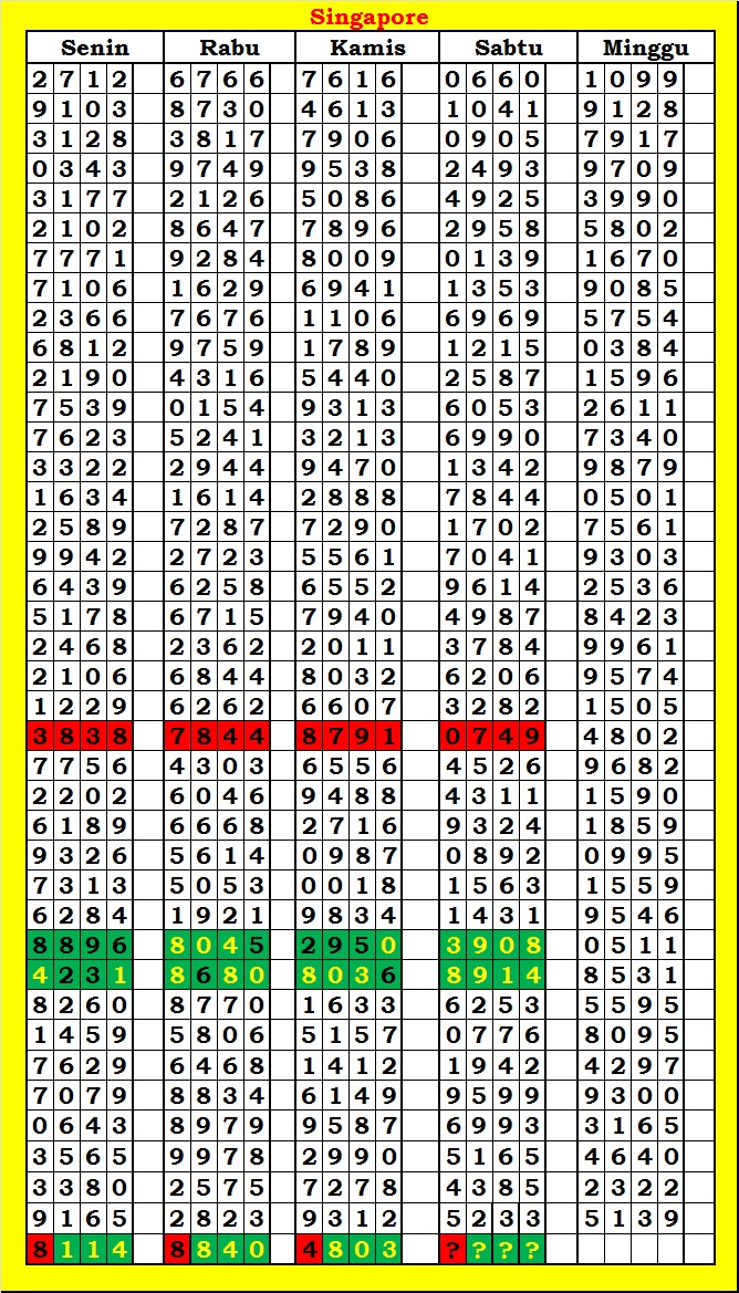 MASTER SINGAPURA Kamis, 05-02-2026 Merupakan Prediksi Otomatis yang menggabungkan Metode Kalender Togel Dengan Rumus-rumus kontrol yang sudah terbukti keakuratanya.Gunakan Aplikasi Rekap untuk mendapatkan LN TOP. Harap Maklum Jika kadang meleset MASTER SINGAPURA kita. Jadikan ini sebagai perbandingan saja dan tetap UPS