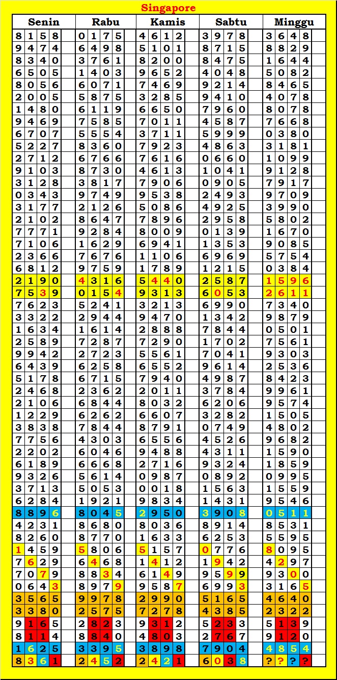 MASTER SINGAPURA Kamis, 05-02-2026 Merupakan Prediksi Otomatis yang menggabungkan Metode Kalender Togel Dengan Rumus-rumus kontrol yang sudah terbukti keakuratanya.Gunakan Aplikasi Rekap untuk mendapatkan LN TOP. Harap Maklum Jika kadang meleset MASTER SINGAPURA kita. Jadikan ini sebagai perbandingan saja dan tetap UPS