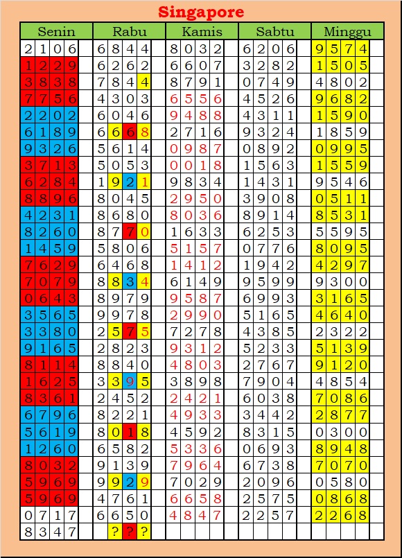 MASTER SINGAPURA Rabu, 04-02-2026 Merupakan Prediksi Otomatis yang menggabungkan Metode Kalender Togel Dengan Rumus-rumus kontrol yang sudah terbukti keakuratanya.Gunakan Aplikasi Rekap untuk mendapatkan LN TOP. Harap Maklum Jika kadang meleset MASTER SINGAPURA kita. Jadikan ini sebagai perbandingan saja dan tetap UPS