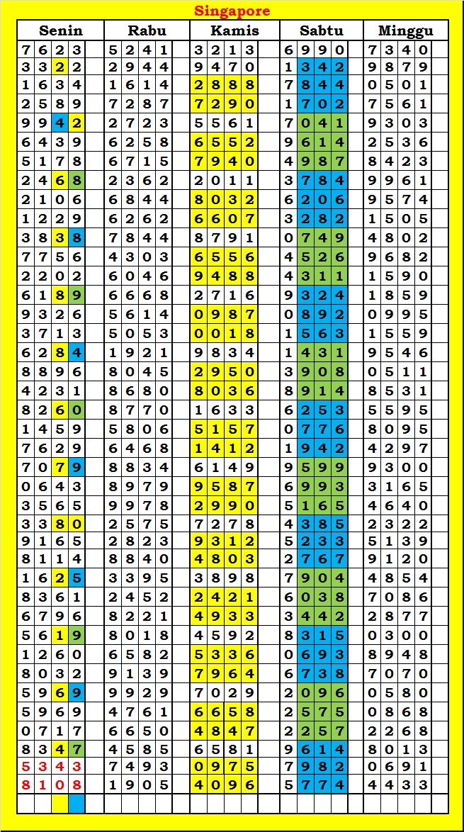 MASTER SINGAPURA Rabu, 04-02-2026 Merupakan Prediksi Otomatis yang menggabungkan Metode Kalender Togel Dengan Rumus-rumus kontrol yang sudah terbukti keakuratanya.Gunakan Aplikasi Rekap untuk mendapatkan LN TOP. Harap Maklum Jika kadang meleset MASTER SINGAPURA kita. Jadikan ini sebagai perbandingan saja dan tetap UPS