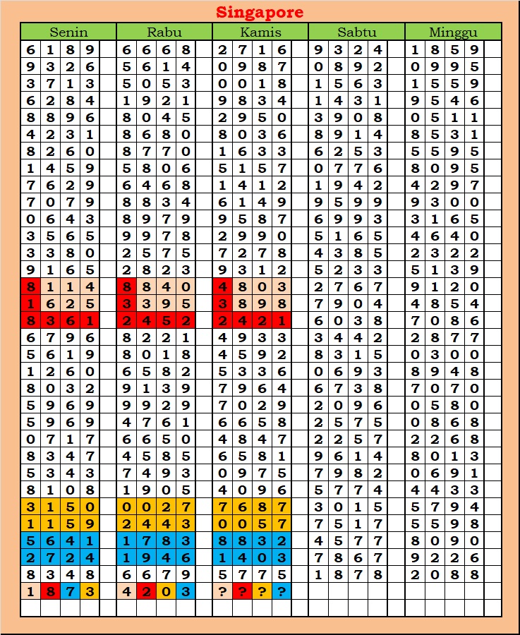 MASTER SINGAPURA Rabu, 04-02-2026 Merupakan Prediksi Otomatis yang menggabungkan Metode Kalender Togel Dengan Rumus-rumus kontrol yang sudah terbukti keakuratanya.Gunakan Aplikasi Rekap untuk mendapatkan LN TOP. Harap Maklum Jika kadang meleset MASTER SINGAPURA kita. Jadikan ini sebagai perbandingan saja dan tetap UPS