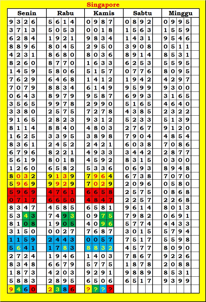 MASTER SINGAPURA Rabu, 04-02-2026 Merupakan Prediksi Otomatis yang menggabungkan Metode Kalender Togel Dengan Rumus-rumus kontrol yang sudah terbukti keakuratanya.Gunakan Aplikasi Rekap untuk mendapatkan LN TOP. Harap Maklum Jika kadang meleset MASTER SINGAPURA kita. Jadikan ini sebagai perbandingan saja dan tetap UPS
