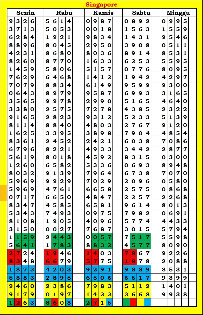 MASTER SINGAPURA Rabu, 04-02-2026 Merupakan Prediksi Otomatis yang menggabungkan Metode Kalender Togel Dengan Rumus-rumus kontrol yang sudah terbukti keakuratanya.Gunakan Aplikasi Rekap untuk mendapatkan LN TOP. Harap Maklum Jika kadang meleset MASTER SINGAPURA kita. Jadikan ini sebagai perbandingan saja dan tetap UPS