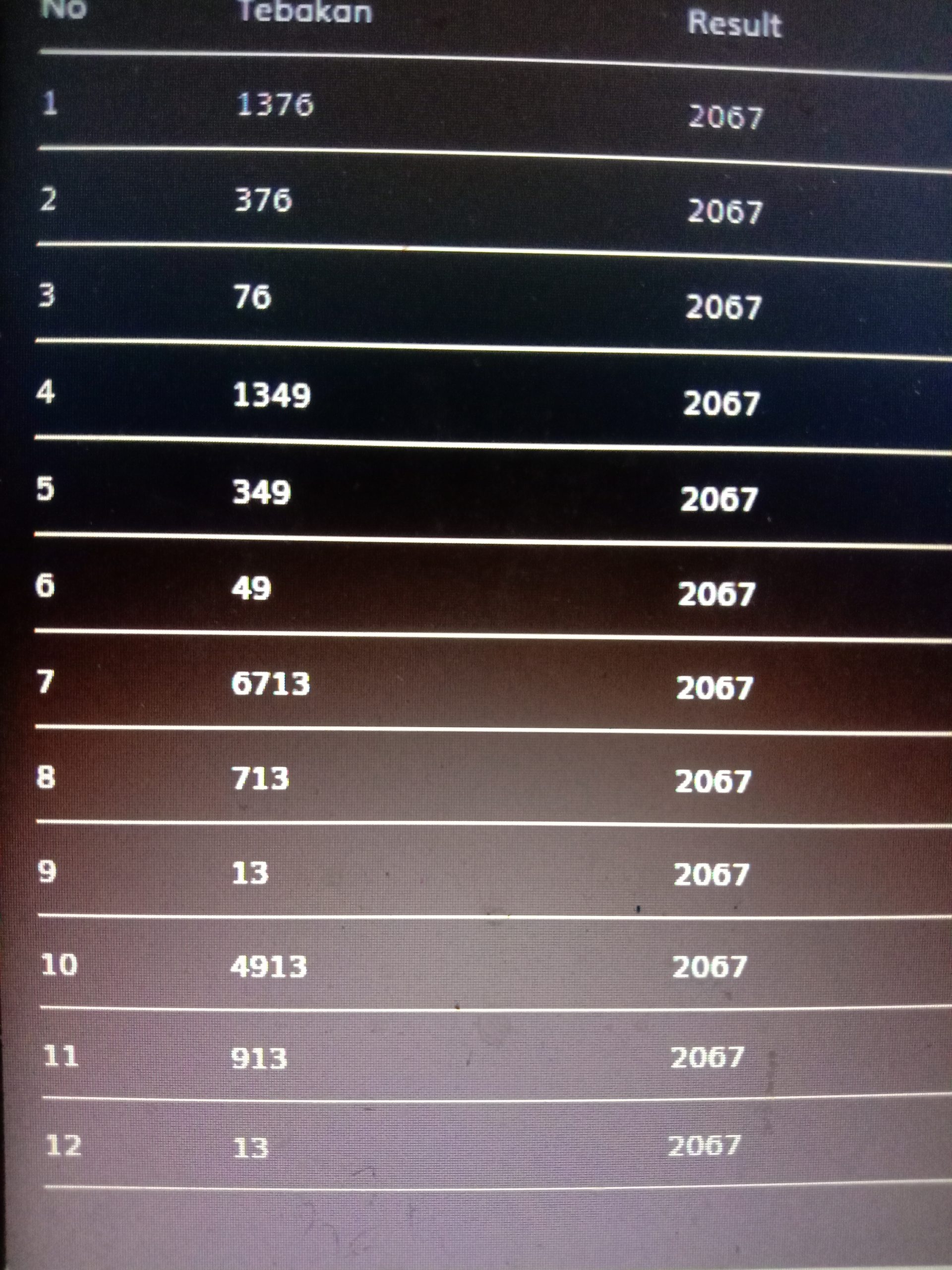 Prediksi Ini Berubah secara otomatis sesuai hari dan result pasaran masing-masing. Untuk melihat prediksi sebelumnya klik tombol nomor hitam diatas