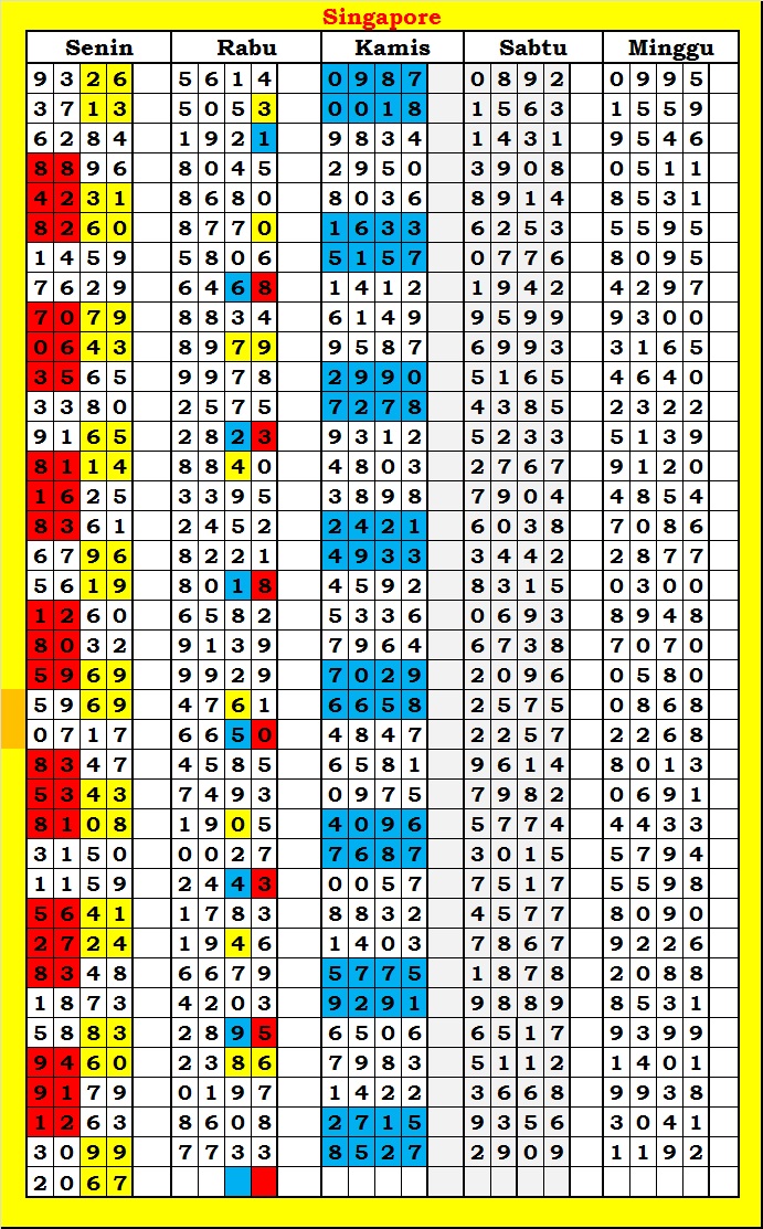 MASTER SINGAPURA Rabu, 04-02-2026 Merupakan Prediksi Otomatis yang menggabungkan Metode Kalender Togel Dengan Rumus-rumus kontrol yang sudah terbukti keakuratanya.Gunakan Aplikasi Rekap untuk mendapatkan LN TOP. Harap Maklum Jika kadang meleset MASTER SINGAPURA kita. Jadikan ini sebagai perbandingan saja dan tetap UPS