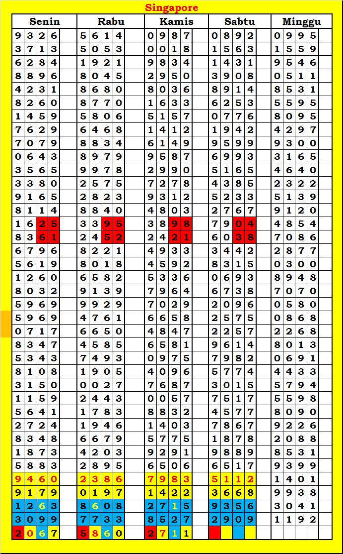MASTER SINGAPURA Rabu, 04-02-2026 Merupakan Prediksi Otomatis yang menggabungkan Metode Kalender Togel Dengan Rumus-rumus kontrol yang sudah terbukti keakuratanya.Gunakan Aplikasi Rekap untuk mendapatkan LN TOP. Harap Maklum Jika kadang meleset MASTER SINGAPURA kita. Jadikan ini sebagai perbandingan saja dan tetap UPS