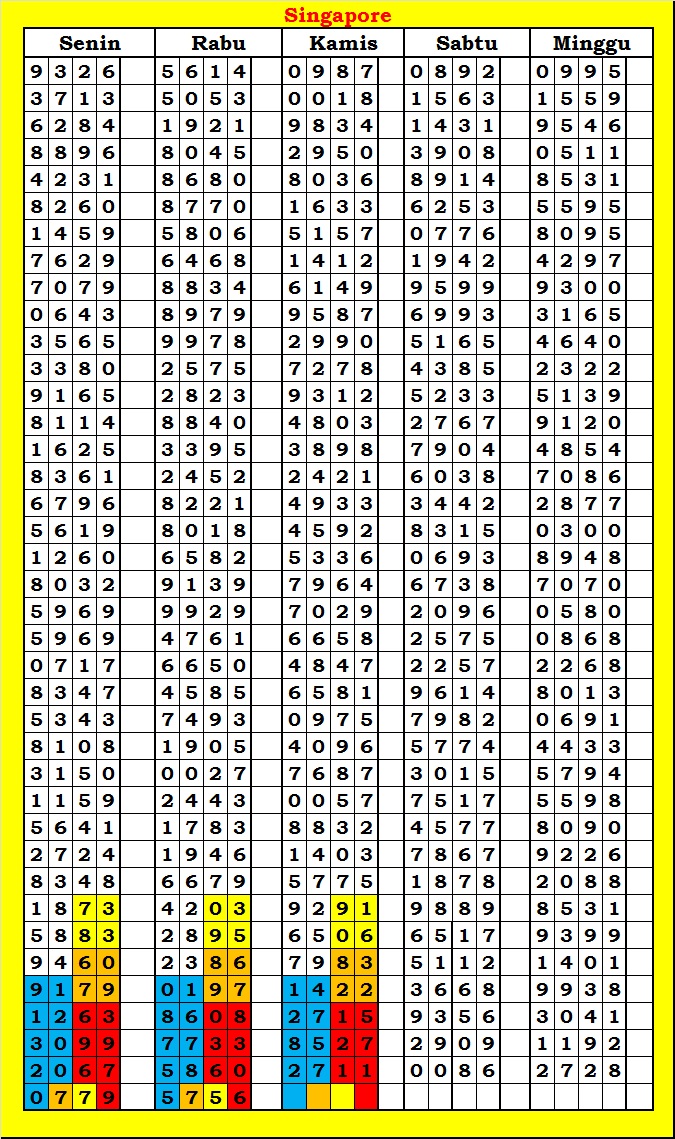 MASTER SINGAPURA Rabu, 04-02-2026 Merupakan Prediksi Otomatis yang menggabungkan Metode Kalender Togel Dengan Rumus-rumus kontrol yang sudah terbukti keakuratanya.Gunakan Aplikasi Rekap untuk mendapatkan LN TOP. Harap Maklum Jika kadang meleset MASTER SINGAPURA kita. Jadikan ini sebagai perbandingan saja dan tetap UPS