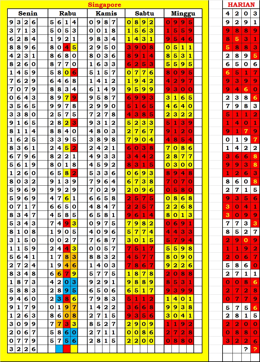 MASTER SINGAPURA Rabu, 04-02-2026 Merupakan Prediksi Otomatis yang menggabungkan Metode Kalender Togel Dengan Rumus-rumus kontrol yang sudah terbukti keakuratanya.Gunakan Aplikasi Rekap untuk mendapatkan LN TOP. Harap Maklum Jika kadang meleset MASTER SINGAPURA kita. Jadikan ini sebagai perbandingan saja dan tetap UPS