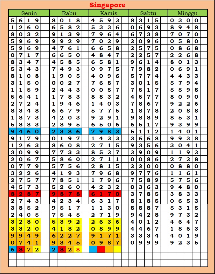 MASTER SINGAPURA Minggu, 01-02-2026 Merupakan Prediksi Otomatis yang menggabungkan Metode Kalender Togel Dengan Rumus-rumus kontrol yang sudah terbukti keakuratanya.Gunakan Aplikasi Rekap untuk mendapatkan LN TOP. Harap Maklum Jika kadang meleset MASTER SINGAPURA kita. Jadikan ini sebagai perbandingan saja dan tetap UPS