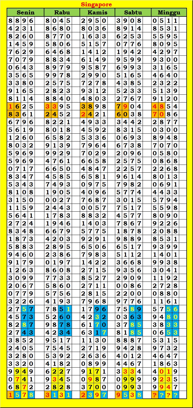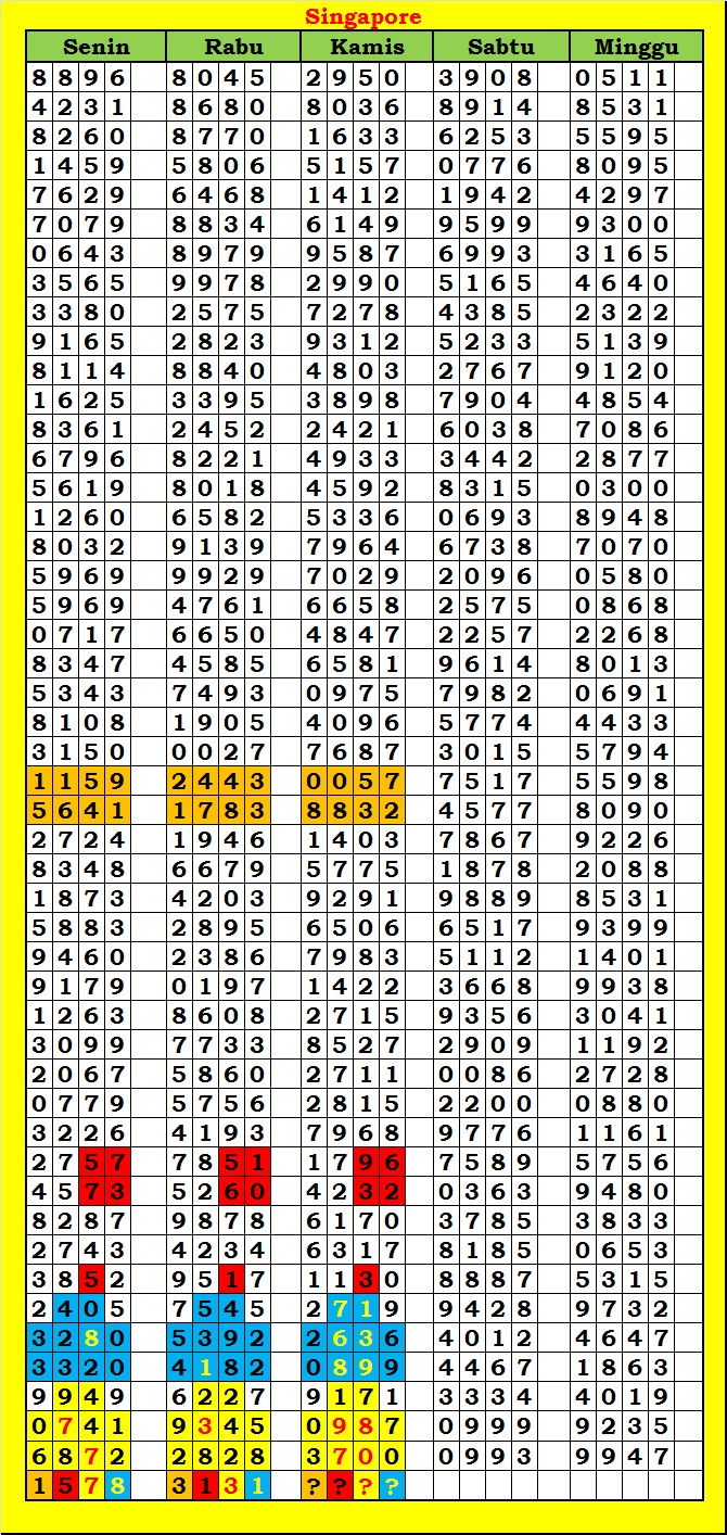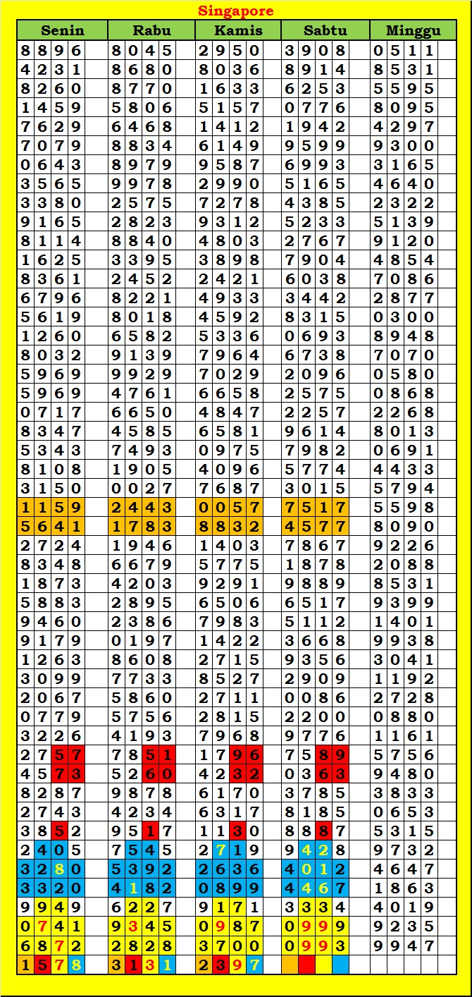 MASTER SINGAPURA Minggu, 01-02-2026 Merupakan Prediksi Otomatis yang menggabungkan Metode Kalender Togel Dengan Rumus-rumus kontrol yang sudah terbukti keakuratanya.Gunakan Aplikasi Rekap untuk mendapatkan LN TOP. Harap Maklum Jika kadang meleset MASTER SINGAPURA kita. Jadikan ini sebagai perbandingan saja dan tetap UPS