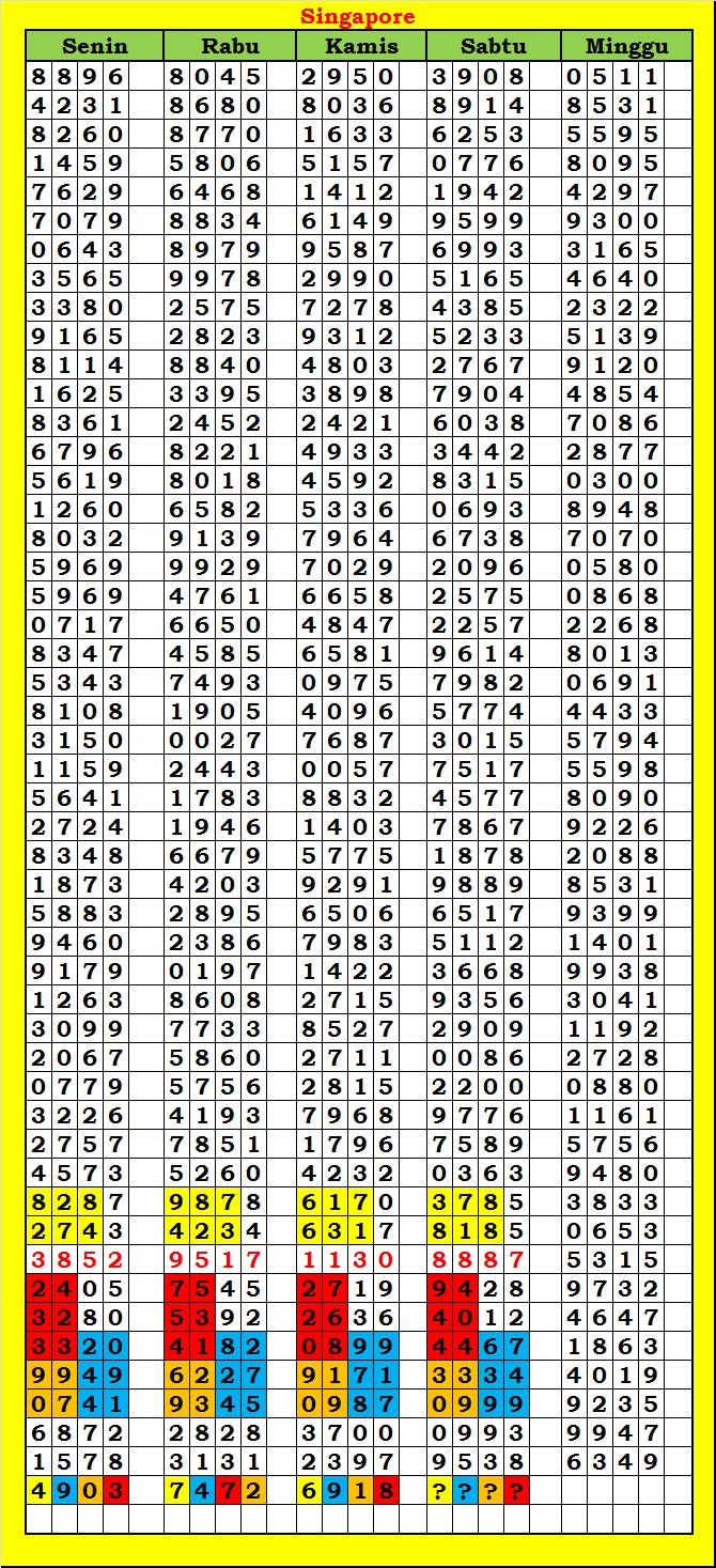 MASTER SINGAPURA Minggu, 01-02-2026 Merupakan Prediksi Otomatis yang menggabungkan Metode Kalender Togel Dengan Rumus-rumus kontrol yang sudah terbukti keakuratanya.Gunakan Aplikasi Rekap untuk mendapatkan LN TOP. Harap Maklum Jika kadang meleset MASTER SINGAPURA kita. Jadikan ini sebagai perbandingan saja dan tetap UPS