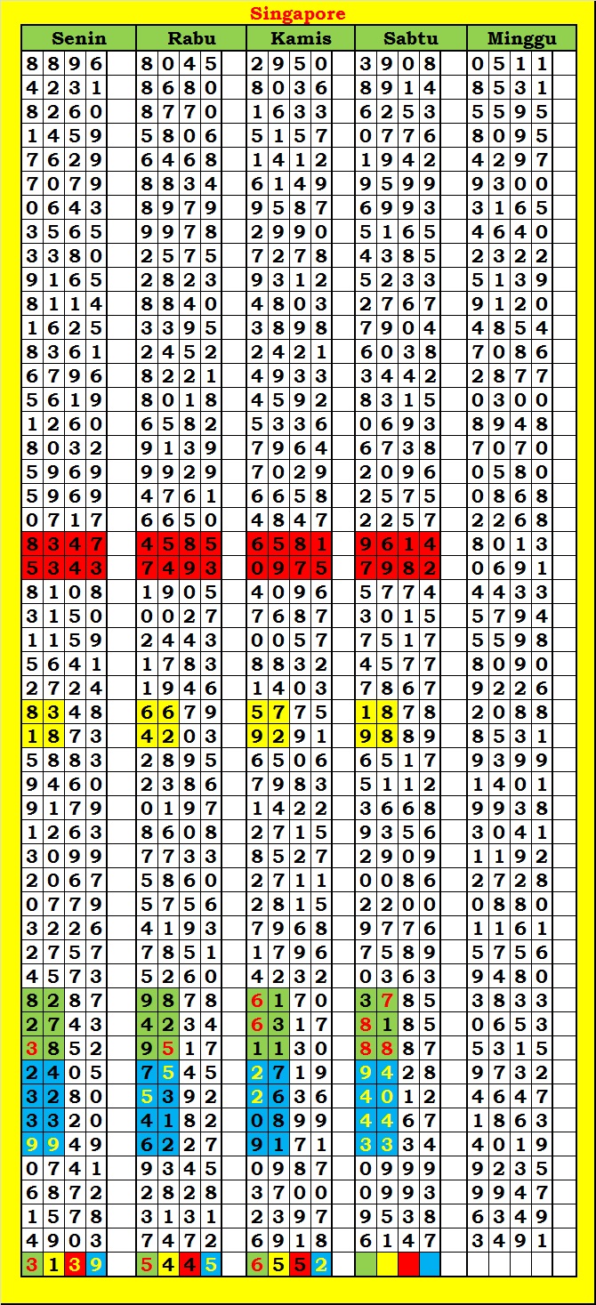 MASTER SINGAPURA Minggu, 01-02-2026 Merupakan Prediksi Otomatis yang menggabungkan Metode Kalender Togel Dengan Rumus-rumus kontrol yang sudah terbukti keakuratanya.Gunakan Aplikasi Rekap untuk mendapatkan LN TOP. Harap Maklum Jika kadang meleset MASTER SINGAPURA kita. Jadikan ini sebagai perbandingan saja dan tetap UPS