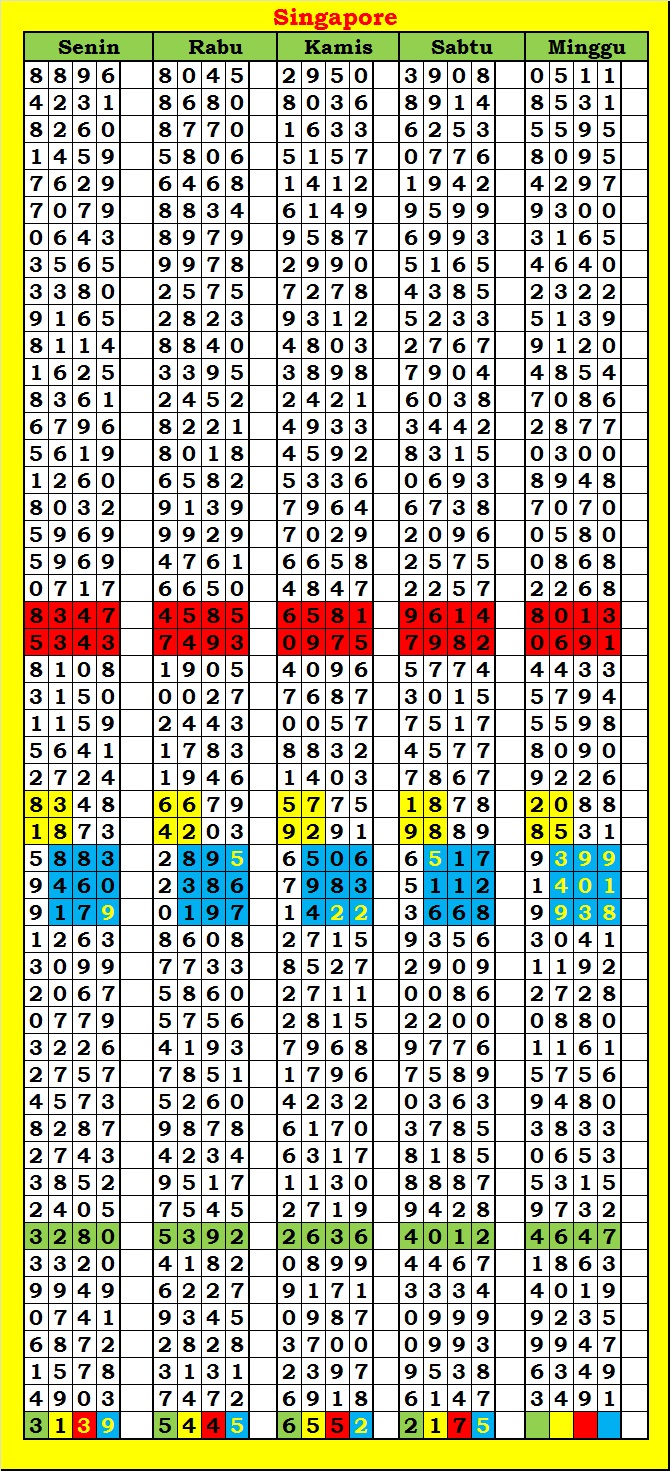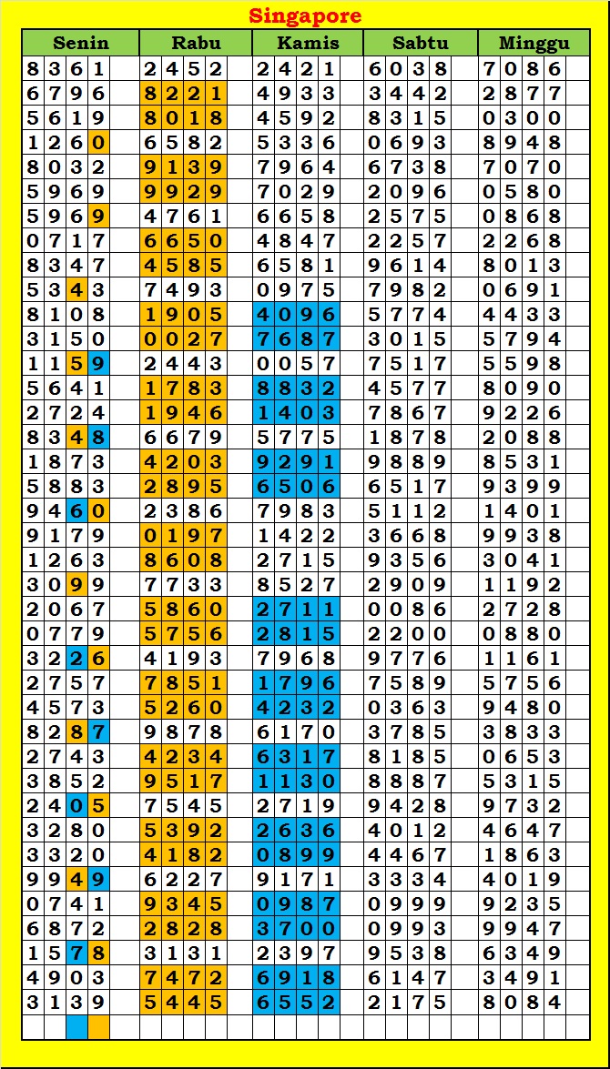 MASTER SINGAPURA Minggu, 01-02-2026 Merupakan Prediksi Otomatis yang menggabungkan Metode Kalender Togel Dengan Rumus-rumus kontrol yang sudah terbukti keakuratanya.Gunakan Aplikasi Rekap untuk mendapatkan LN TOP. Harap Maklum Jika kadang meleset MASTER SINGAPURA kita. Jadikan ini sebagai perbandingan saja dan tetap UPS