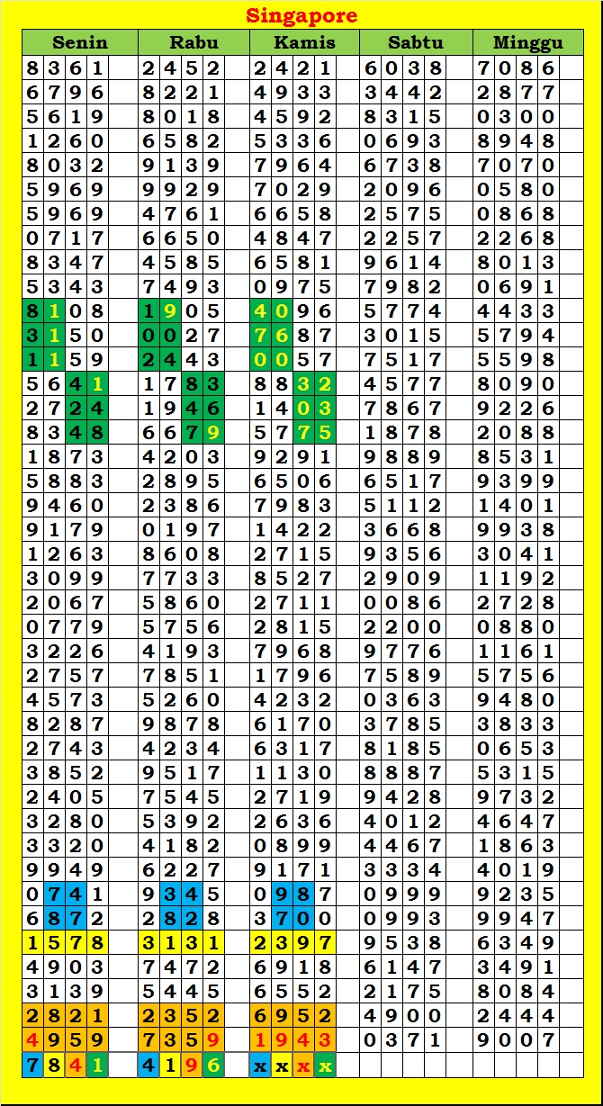 MASTER SINGAPURA Minggu, 01-02-2026 Merupakan Prediksi Otomatis yang menggabungkan Metode Kalender Togel Dengan Rumus-rumus kontrol yang sudah terbukti keakuratanya.Gunakan Aplikasi Rekap untuk mendapatkan LN TOP. Harap Maklum Jika kadang meleset MASTER SINGAPURA kita. Jadikan ini sebagai perbandingan saja dan tetap UPS