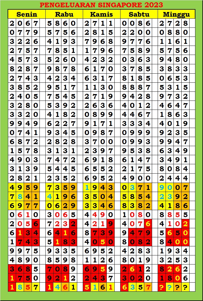MASTER SINGAPURA Sabtu, 31-01-2026 Merupakan Prediksi Otomatis yang menggabungkan Metode Kalender Togel Dengan Rumus-rumus kontrol yang sudah terbukti keakuratanya.Gunakan Aplikasi Rekap untuk mendapatkan LN TOP. Harap Maklum Jika kadang meleset MASTER SINGAPURA kita. Jadikan ini sebagai perbandingan saja dan tetap UPS