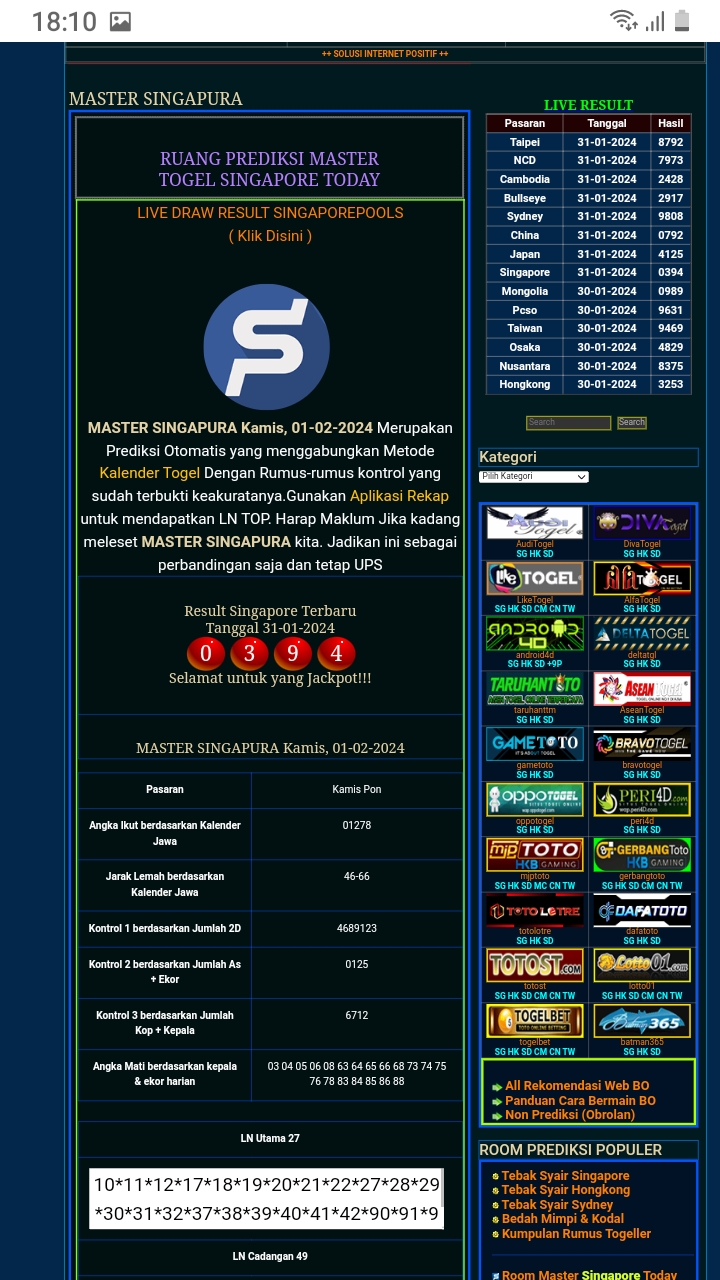 MASTER SINGAPURA Sabtu, 31-01-2026 Merupakan Prediksi Otomatis yang menggabungkan Metode Kalender Togel Dengan Rumus-rumus kontrol yang sudah terbukti keakuratanya.Gunakan Aplikasi Rekap untuk mendapatkan LN TOP. Harap Maklum Jika kadang meleset MASTER SINGAPURA kita. Jadikan ini sebagai perbandingan saja dan tetap UPS
