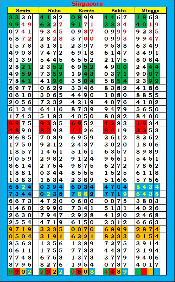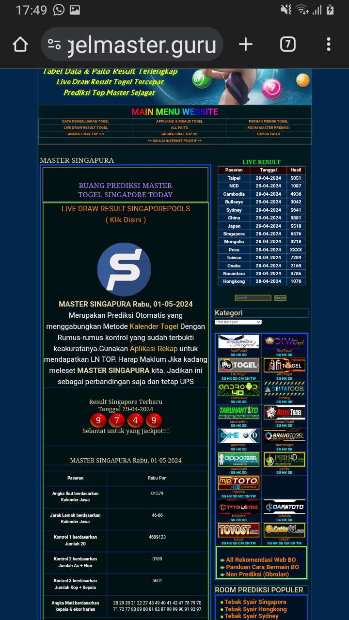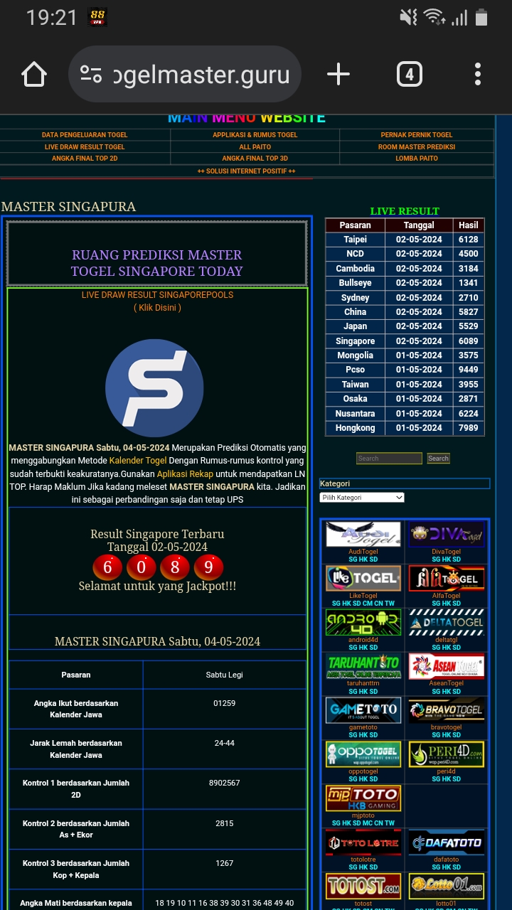 MASTER SINGAPURA Sabtu, 31-01-2026 Merupakan Prediksi Otomatis yang menggabungkan Metode Kalender Togel Dengan Rumus-rumus kontrol yang sudah terbukti keakuratanya.Gunakan Aplikasi Rekap untuk mendapatkan LN TOP. Harap Maklum Jika kadang meleset MASTER SINGAPURA kita. Jadikan ini sebagai perbandingan saja dan tetap UPS