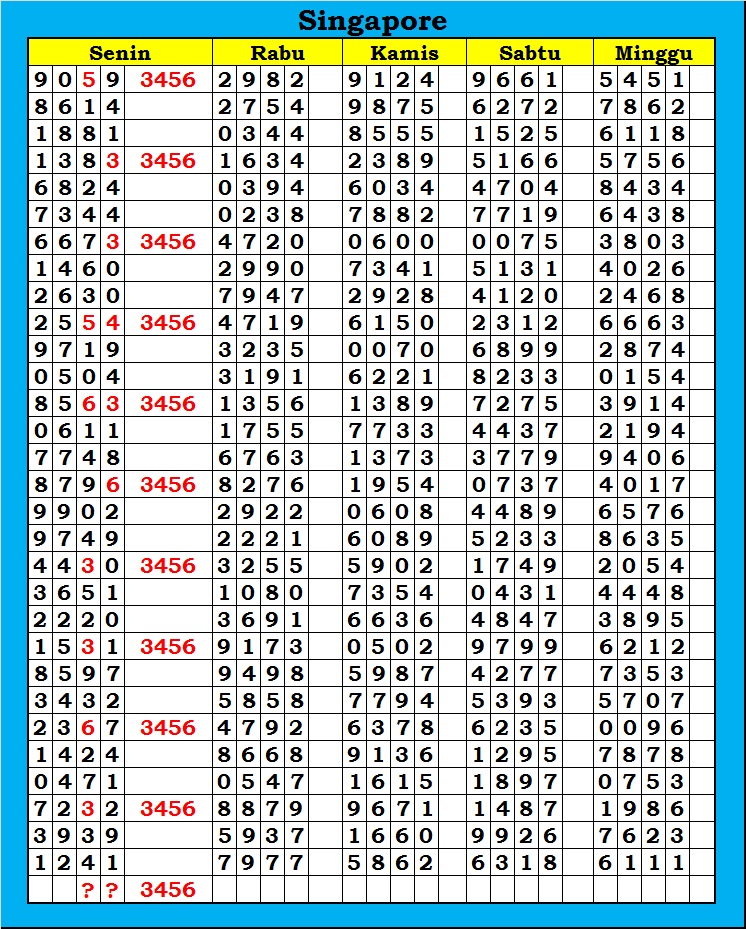 MASTER SINGAPURA Sabtu, 31-01-2026 Merupakan Prediksi Otomatis yang menggabungkan Metode Kalender Togel Dengan Rumus-rumus kontrol yang sudah terbukti keakuratanya.Gunakan Aplikasi Rekap untuk mendapatkan LN TOP. Harap Maklum Jika kadang meleset MASTER SINGAPURA kita. Jadikan ini sebagai perbandingan saja dan tetap UPS