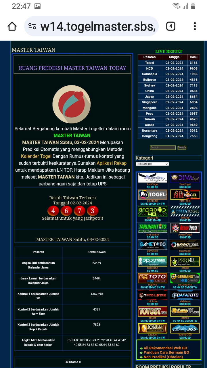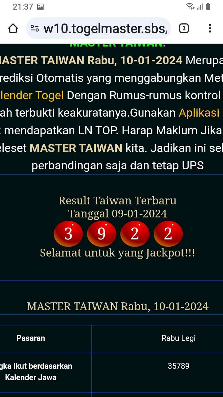 MASTER TAIWAN Minggu, 25-01-2026 Merupakan Prediksi Otomatis yang menggabungkan Metode Kalender Togel Dengan Rumus-rumus kontrol yang sudah terbukti keakuratanya.Gunakan Aplikasi Rekap untuk mendapatkan LN TOP. Harap Maklum Jika kadang meleset MASTER TAIWAN kita. Jadikan ini sebagai perbandingan saja dan tetap UPS